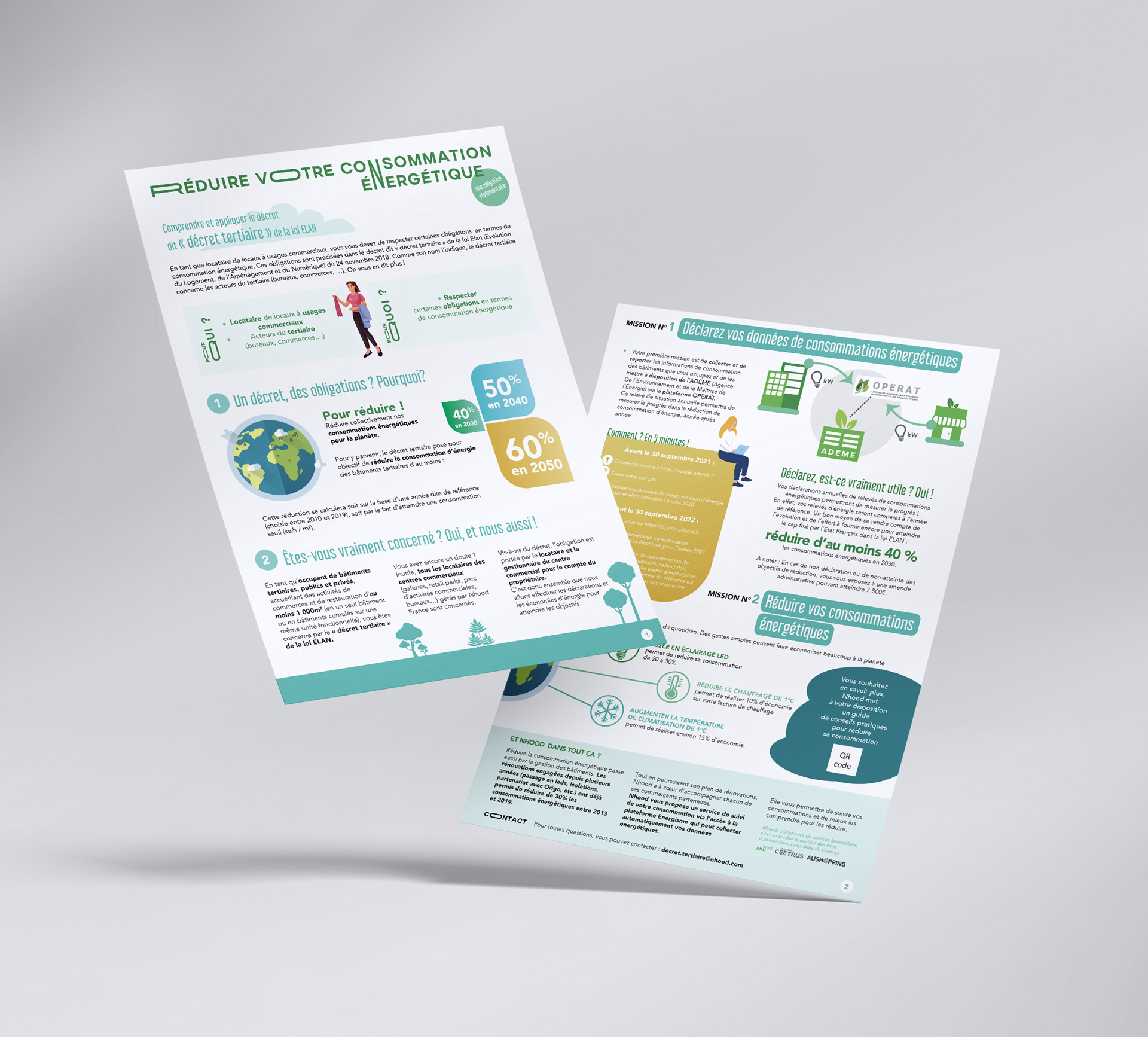 Conception graphique et mise en page d'une plaquette destinées aux commerçants des centres commerciaux afin de les informer sur certaines réglementations en matière d'écologie. Travail réalisé en tant de graphiste salariée chez Nhood France.